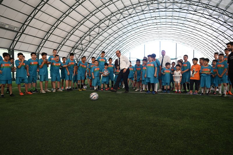 Gençlerin talebi üzerine penaltı atışı da yapan Başkan Geçit, ziyaret sonunda minik futbolcularla hatıra fotoğrafı çektirip, kurs formalarını hediye etti.