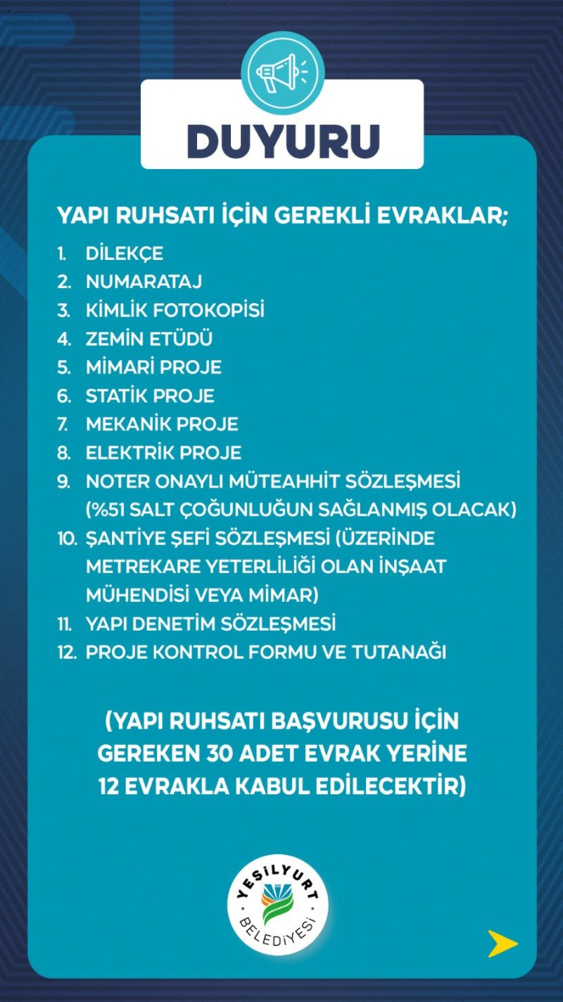 "Yerinde Dönüşüm Projesi" hakkından faydalanmak isteyen vatandaşlar, dilekçe, numarataj, kimlik fotokopisi, zemin etüdü, mimari proje, statik proje, mekanik proje, elektrik projesi, %51 salt çoğunluğun sağlanmış olan noter onaylı müteahhit sözleşmesi, şantiye şefi sözleşmesi (üzerinde metrekare yeterliliği olan inşaat mühendisi veya mimar), yapı denetim sözleşmesi ve proje kontrol formu ve tutanağıyla birlikte Yeşilyurt Belediyesi Hizmet Binası ikinci katındaki İmar ve Şehircilik Müdürlüğü’ne başvuru yapmaları gerekiyor. Bununla birlikte vatandaşların, hibe ve kredi imkanından faydalanabilmesi için yapı ruhsat sürecini yapı denetim firmaları, proje müellifleri ve müteahhit firmalar üzerinden takip etmeleri gerektiği açıklamada yer aldı.