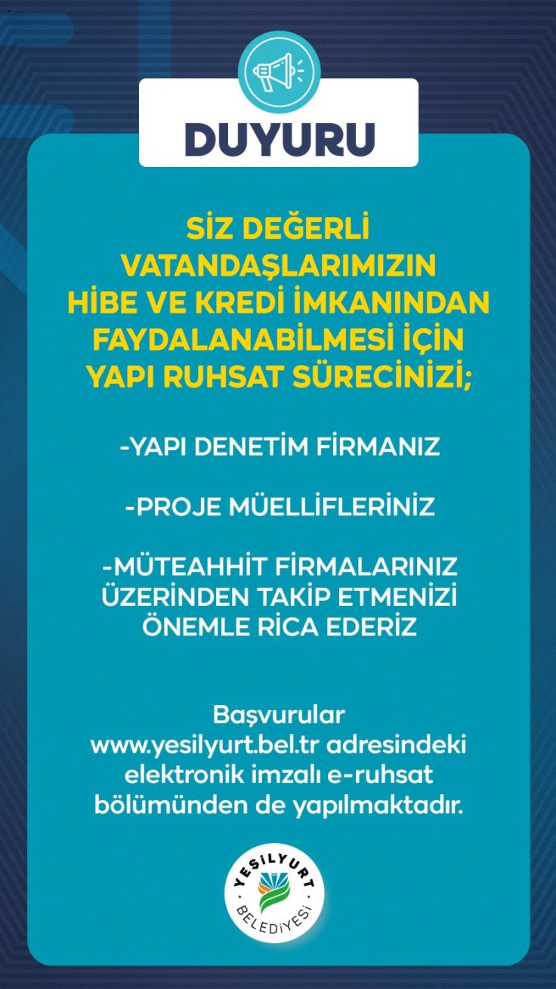 Yeşilyurt Belediyesi İmar ve Şehircilik Müdürlüğü’nden yapılan bilgilendirmeye göre; 30 Haziran 2025 tarihine kadar Yapı Ruhsatı alınmadığı takdirde Çevre, Şehircilik ve İklim Değişikliği Bakanlığınca verilen 750.000 TL. hibe ve 750.000 TL. kredi hakkından faydalanılamayacağı ifade edildi.