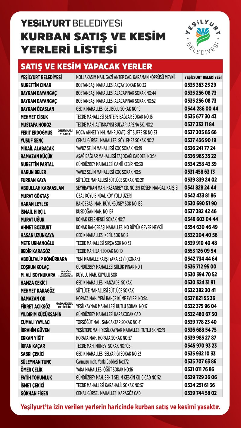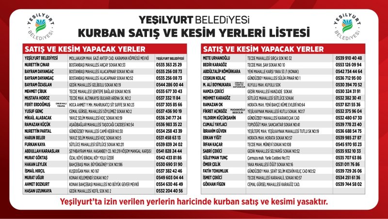 Vatandaşların kurban ibadetlerini kolay, rahat ve hijyenik ortamlarda idrak etmeleri için hareket geçen Yeşilyurt Belediyesi, 41 ayrı noktada kurban satış ve kesim yeri belirledi. Yeşilyurt Belediye Başkanı Prof. Dr. İlhan Geçit’in talimatıyla Kurban Bayramı için her türlü önlemi alan Yeşilyurt Belediye ekipleri, kurban satış ve kesim yerlerinde gerekli düzenleme ve dezenfekte çalışmalarını yaparak, vatandaşların kullanımına hazır hale getirecek. Satış yerleri ise zabıta ekipleri tarafından düzenli olarak denetlenerek, vatandaşların sağlıklı ve temiz ortamda bayramını geçirmelerini sağlanacak.